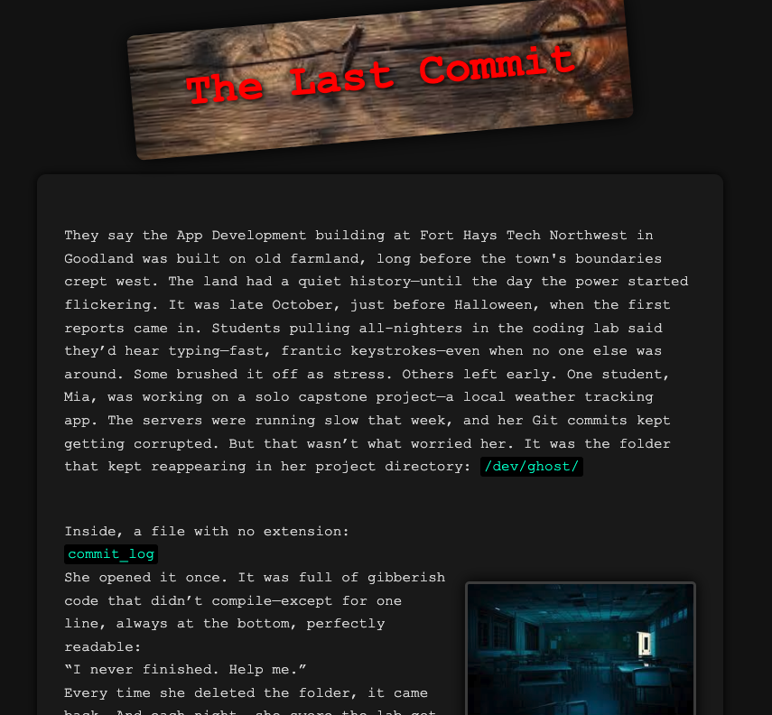 The Last CommitThis is a scary story page that I made when the entire class was tasked to design a website that had scary stories for Halloween.